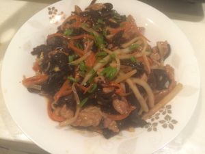 加入青椒丝、胡萝卜丝、黑木耳丝炒,炒至蔬菜稍软加如预先调好的酱汁