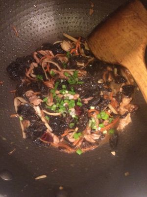肉丝先油炒过捞出,材料全部下去后炒熟放肉丝 最后撒葱