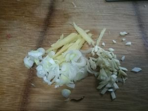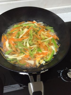 猪通脊切丝,用盐、料酒、鸡蛋清、淀粉腌制; 辣椒 胡萝卜 白色的是剩的千叶豆腐 (也可以用冬笋)切条,姜和蒜一比一切沫调汁备用;另切些姜蒜爆锅用;