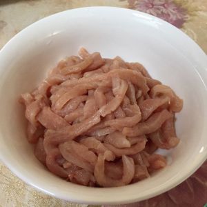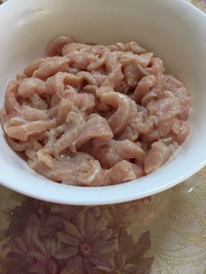 鸡胸切丝,加少许白胡椒粉,料酒,生抽,少许老抽,玉米淀粉拌匀腌制20分钟。