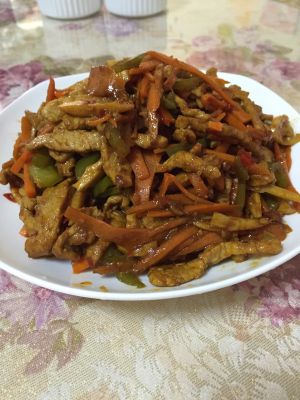 将肉丝 木耳 辣椒 冬笋(我用的千叶豆腐)全部倒入锅中翻炒 倒入调制的鱼香汁 快速翻炒 大火收汁 出锅前可点两滴香油