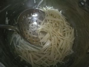 腌制好的鸡丝加少量食用油,上锅炒熟,盛出备用