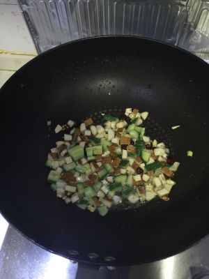 在一次放入黄瓜丁和豆腐干丁翻炒