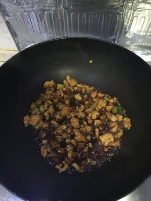 锅内放油,接着放花椒,葱,姜,蒜瓣,腌好的鸡丁入锅,放糖,鸡丁炒至全部发白就熟了,然后放黄瓜,胡萝卜,玉米粒,加少许料酒,放生抽,炒两分钟,放蚝油,最后放味精,淀粉收汁