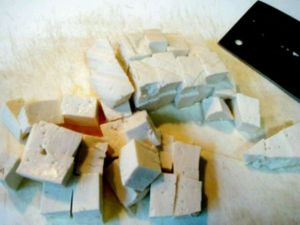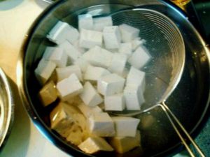 在清水里放少许盐,把切好的豆腐放在水里浸泡15分钟后捞出备用