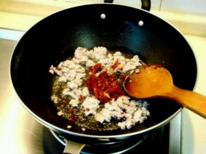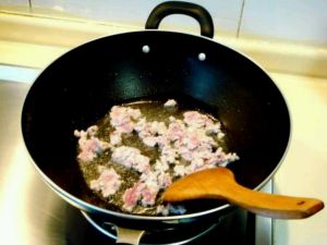 炒勺上火烧热,注入适量花生油便炒肉末。