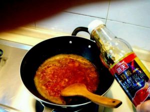 烹入黄酒炒匀,倒入肉汤并放入酱油、盐调味