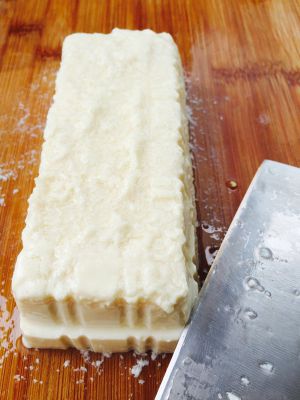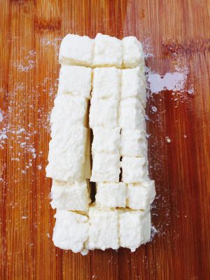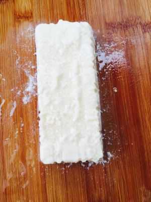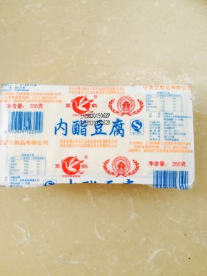 将内酯豆腐小心的倒在菜板上(先用巴掌轻轻的敲打下豆腐盒的四周、然后一只手拿着盒子,另一手掌轻轻一拍盒子底部,豆腐就安全的着落在菜板上了,哈哈)