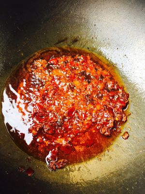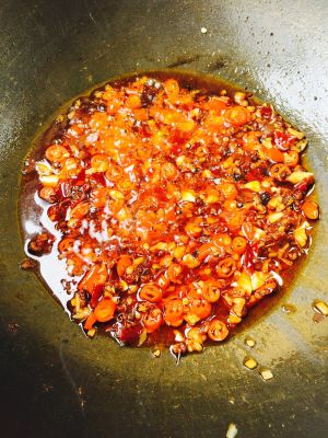 豆瓣酱炒出红油后,放入花椒、指天椒、大蒜、姜末、继续翻炒。