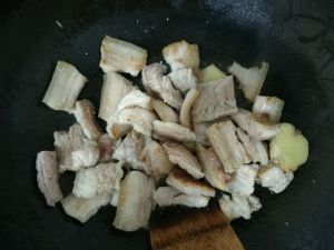 五花肉大块焯水,加三片姜,煮几分钟,筷子可以戳过就取出。切片。再下锅中小火煸炒,直到发黄微焦。
