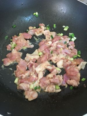 热锅倒入油,将葱花倒入锅中煸出香味,将腌好的鸡肉倒入锅中翻炒~