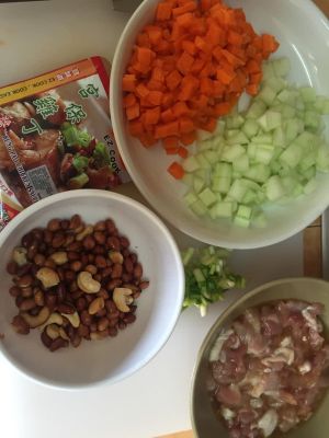 准备材料。鸡腿去骨切丁,用适量盐、料酒、生抽和淀粉腌制十分钟。胡萝卜和黄瓜去皮切丁。葱切丁。花生和腰果入锅炒熟备用~