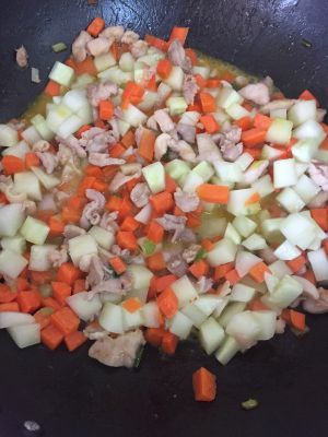 另起一平底炒锅,放少许油,放入葱段、胡萝卜丁、彩椒和黄瓜丁小火翻炒至熟。