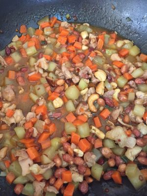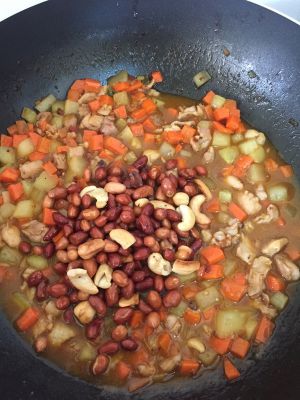 大火收汁后,倒入熟的花生粒和腰果粒~