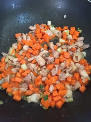 锅里入油,中小火,油温6成热左右下腌好的鸡丁,用漏勺滑动,2分钟左右,鸡丁松散分离状态时,捞出备用,余温放入胡萝卜丁迅速捞出备用。