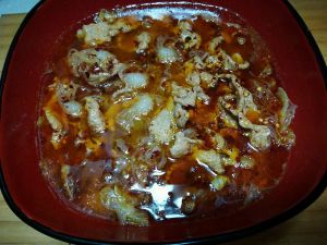 依次放入郫县豆瓣,火锅底料炒制,放少量生抽提味,加适量水,水开,放入腌制好的肉片,将肉片划散,肉熟,(大致煮一分钟即可起锅)