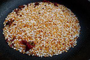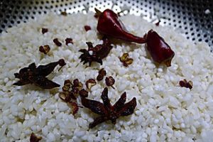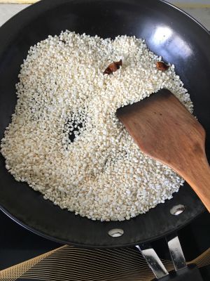 大米和糯米1:1,放入一颗八角小火炒金黄