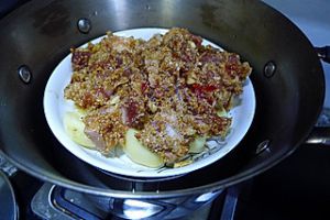 将腌好的肉拌入蒸肉粉,上锅蒸一到一个半小时,(也可在肉底下放入芋仔或土豆垫底,我今天来不及买了)
