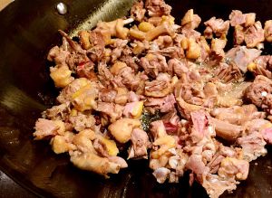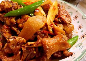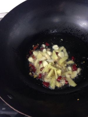 油烧热,放花椒、鸭肉下锅爆炒至鸭肉表皮金黄,爆炒时可以加入大蒜一起