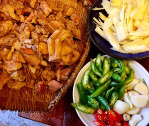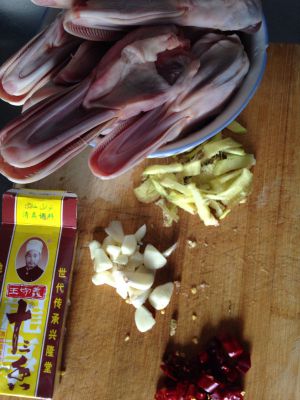 鸭腿切小块葱姜蒜花椒麻椒树椒丝都放盘里备用