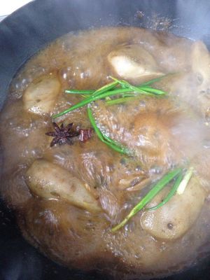 把鸭头放好后上面铺点茴香桂皮小葱加盖直至汁收干