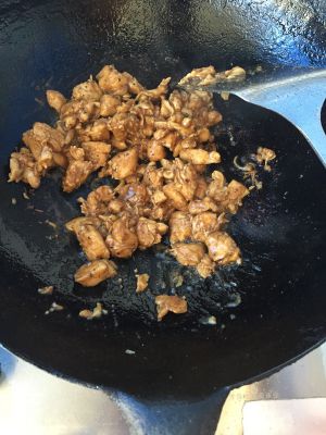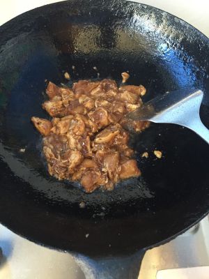 冷油下鸡丁翻炒,在油慢慢变热的同时,滑熟至肉质从粉色变为米黄色,即为八分熟,捞出备用。然后热油中下入切好的甜辣椒丁,翻炒几下断生,捞出备用。