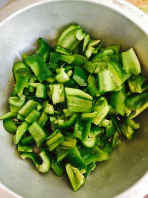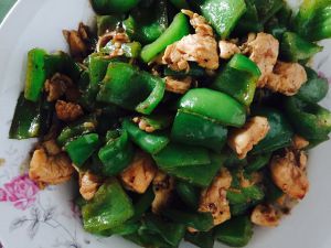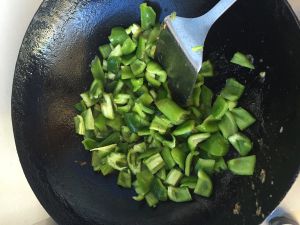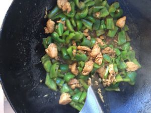 锅内倒入油适量,用于滑炒鸡丁和青椒(用量比炒菜的底油要多)