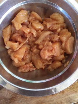 鸡胸肉加少许盐,酱油,料酒,腌制3分钟