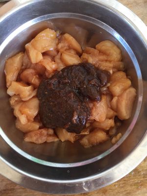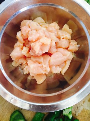 鸡肉切好,不要切太大块,放盐,鸡精,白酒,辣椒面,腌制一到两个小时,一定要入味道,最后放点淀粉。