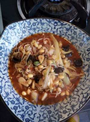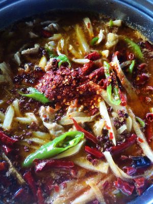 锅里烧些水,把藕片 红萝卜放在水里抄熟 捞起放在大盘子底 在将白菜 豆干 青辣椒同样的一起煮熟放在盘子底备用 。 锅烧热加入少许油等油热后放入花椒 干红辣椒炒至辣椒变成棕色关火把油和辣椒倒入小碗中备用。 再起油锅加入姜蒜末 两勺郫县豆瓣酱炒出红油后加入葱段鞭香 加入一大碗清水加入鸡精 酱油少量的调味,水开把腌好的肉片一片一片的放入锅中(动作快一些)等水再次开就马上关火。