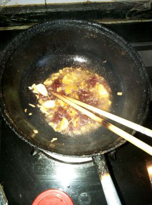 另起锅加油烧热加豆辨酱葱姜蒜煸炒加断生的菜翻炒出锅