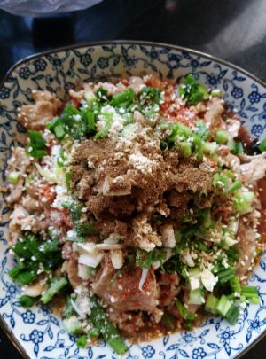 上面加少许过肉片的汤再放蒜末小葱末白芝麻辣椒面花椒粉鸡精粉盐,再另起锅放多些锅烧油炝在调料上面,就完成了