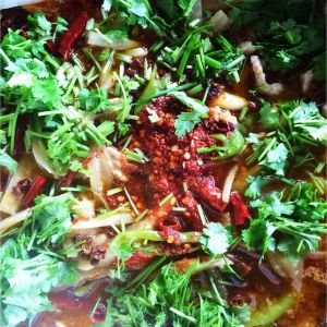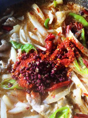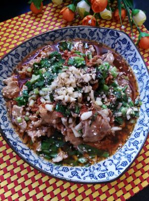 煮好的肉片倒入装着陪菜的盘子子里,把炸好的干辣椒和花椒油淋再上面,撒上蒜沫 干辣椒面 白芝麻在放点香菜薄荷叶在旁边。 天