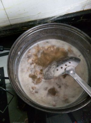 汤开后放入萝卜丝煮,同时放入盐,味精,鸡精调味。