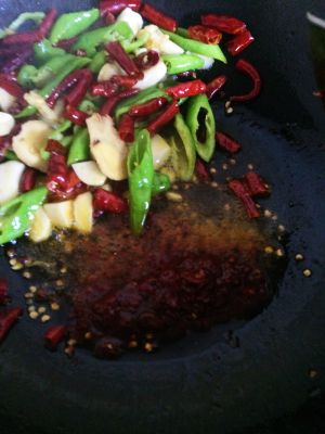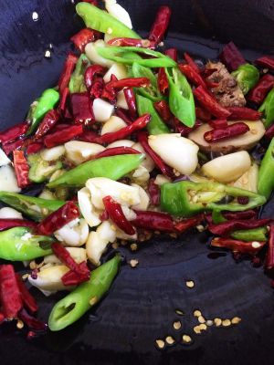 调料下油锅炒出香味(炒时油锅大火开后转中火在下料快速翻炒,这样干辣椒不会炒胡)。