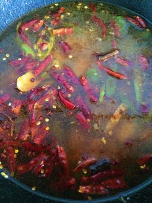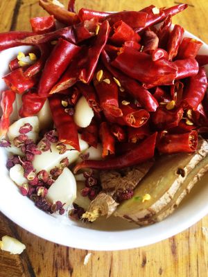 生姜切片,干辣椒切段,大蒜拍破,加上些干花椒粒。