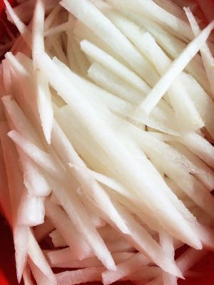 在腌制过程中就可以把白萝卜切成细条。(我不建议用工具叉丝,那样的萝卜丝太细,而且水分流失,煮出来没有味道)