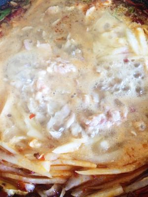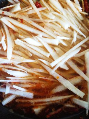 当萝卜丝煮至7、8层熟时,加入肉片煮熟。