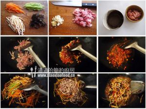 炒锅烧热后放油,不等油热,马上下肉丝划炒散,待肉丝变色后立刻盛出待用。