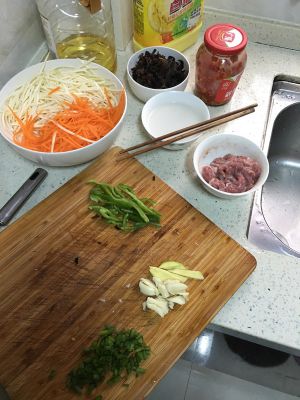 冬笋、青椒、黑木耳、胡萝卜、里脊肉分别切均匀细丝,姜蒜切碎米待用。