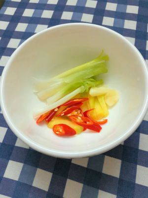 ⒋姜 蒜 切片,葱白切段,用刀拍扁。指天椒 切片,