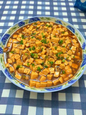 ⒌锅大火烧热,放油 转小火 把备好的 姜 蒜 葱段 指天椒 爆香捞出丢掉。(因本人不喜欢吃这些东西 所以喜欢的亲可以都切末爆香)后放入备好的肉末 中大火炒散 炒至差不多熟 放入切好的豆腐 放少许生抽 加入一碗水 放少许鸡粉 少许盐 少许老抽(只为上色无需多) 稍稍搅拌一下 大火煮滚 放少许糖 接着 放入 水+淀粉 勾芡 煮一两分钟 期间翻炒均匀即可出锅啦