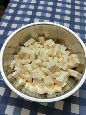 豆腐切小方块,用盐水煮三分钟,少许盐,煮好备用