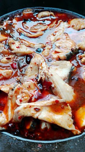 锅内加入适量花生油,花椒、辣椒、八角、香叶洗净爆香,然后把煮过鱼骨头的汤汁倒进去、放2勺郫县豆瓣酱,大火烧开改小火,将鱼片一片一片的放进去,再煮5分钟左右,装盘撒上香葱即可。