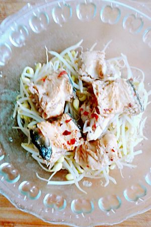 黄豆芽用开水烫一下,断生即可。纯净水烧开,放鱼骨煮5分钟左右,将黄豆芽和鱼骨放在盘底备用。