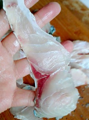 整个鱼去头去尾去骨,片成鱼片,鱼片用水冲洗干净