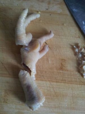 买回来的鸡爪解冻后剪去指甲后用冷水泡30分钟左右把血水泡出来,并用流水清洗干净备用。