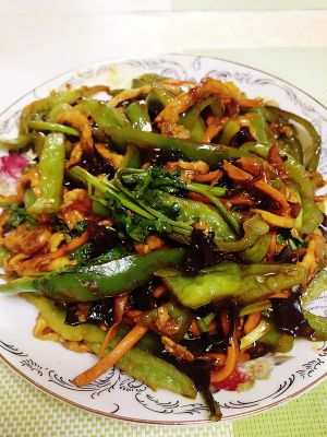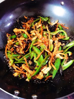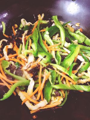 热油 炒蒜姜辣椒粒 放入香菇 胡萝卜 青椒 木耳丝(先炒不好熟的)再放入肉丝 和调料汁 即可