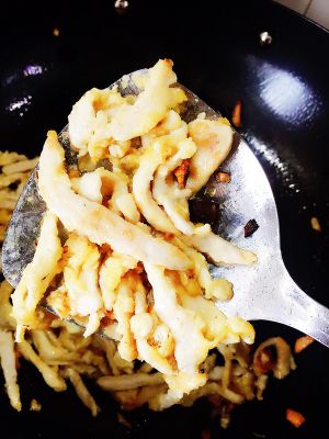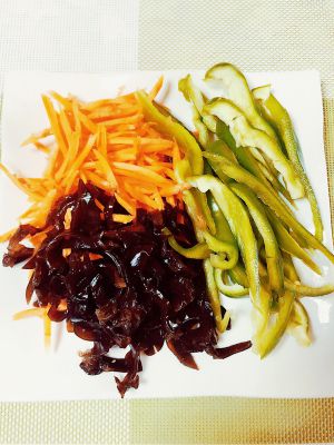 木耳提前泡好,与茭白、胡萝卜都切丝备用。