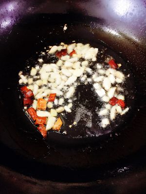 滑炒到肉丝变白,加入泡椒和姜蒜,翻炒约两分钟,炒出红油。